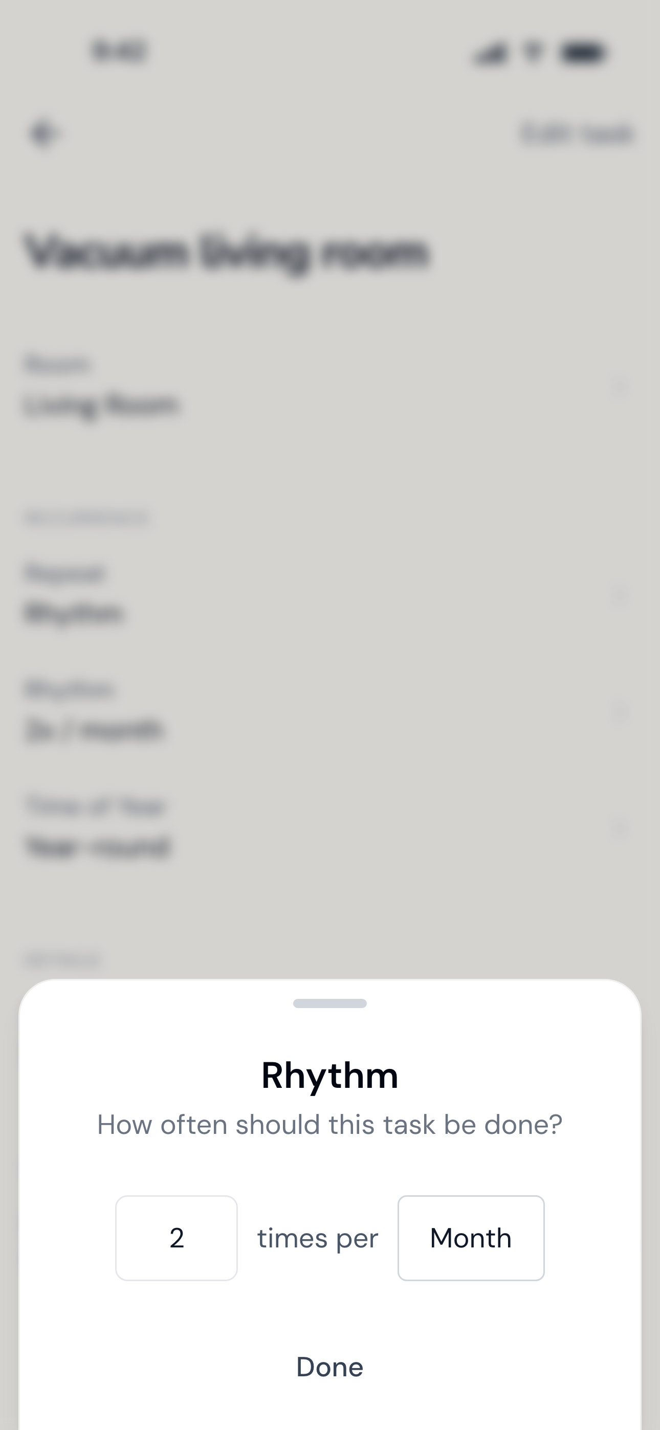FreshChores keeps track of each task's rhythm and surfaces it when it's relevant again. No rigid schedules, no due dates — just a natural cadence that adapts to how your household actually works.